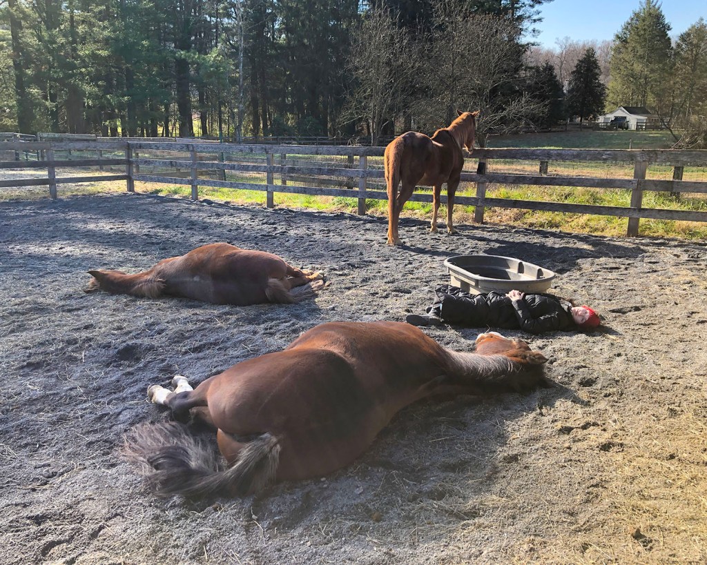 People have reported feeling strong waves of emotion, immense gratitude, specific visual images, and sometimes entire messages that felt like direct conversation from them. The horses do not have to be lying down for this to happen, but sometimes it seems to be how they find “a way in” with people. Let me be very transparent here… I am extremely skeptical of most people with the title “Animal Communicator.” I have had some unfortunate experiences involving self-professed animal communicators with the horses. What I am witnessing here feels like a different way of sharing feelings and insight. Perhaps it is simply that the horses are creating time and space for people to relax enough to feel their own inner knowing with more clarity. Perhaps it is a non-verbal way to communicate that is beyond body language. Perhaps it is a combination of both.