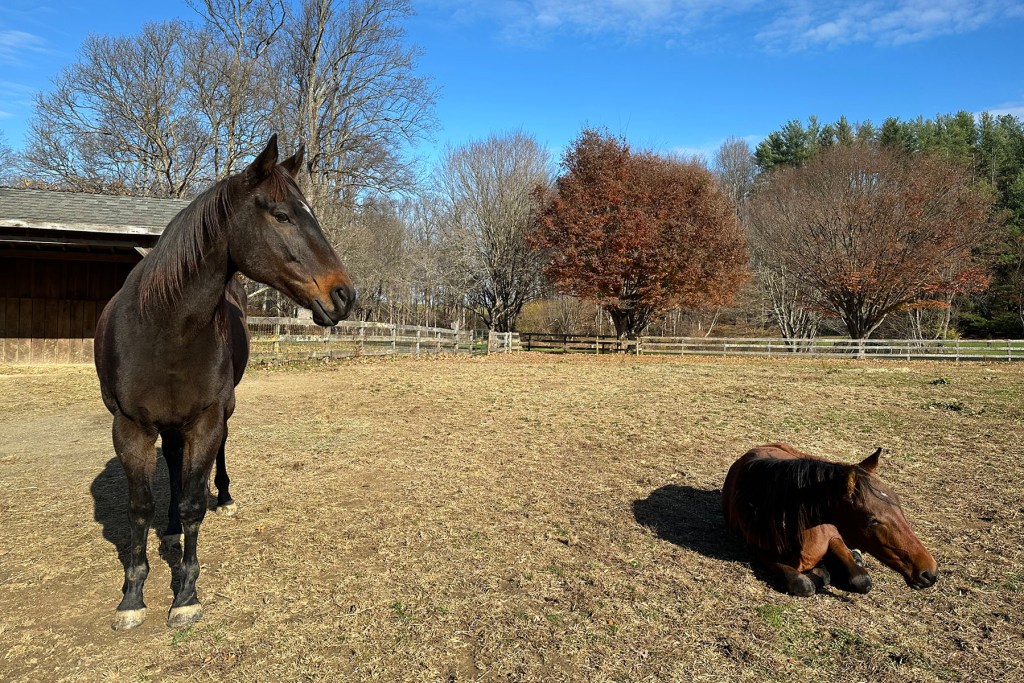 Every time since then, when the little guy is lying down, Chip stands watch over him. He has become like a big brother – still testing him, and pushing on him at times, but sharing hay, sharing space, watching over him when he’s resting. And the yearling runs after him, follows his lead, and finds security being near him. It is a symbiotic relationship, nourishing both of them.